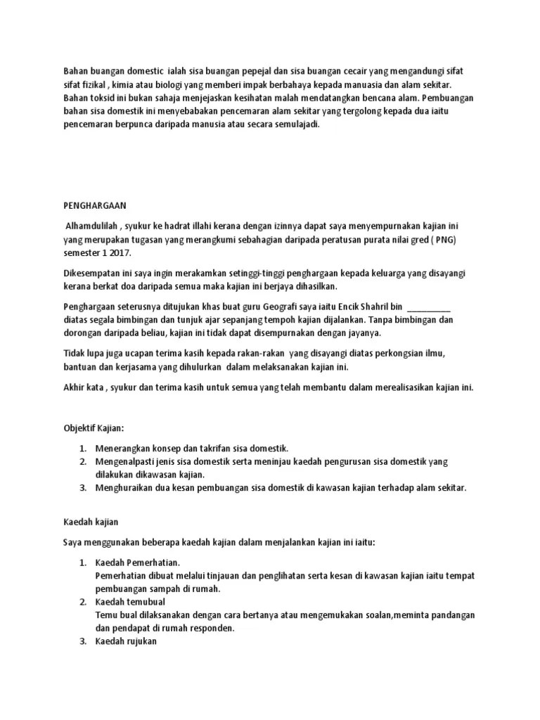 Pendahuluan saya telah menjalankan kerja kursus geografi tingkatan 1 yang bertajuk kajian lapangan tentang "sisa domestik" di . Penghargaanbersyukur saya kepada tuhan kerana dengan keizinannya dapat saya menyiapkankerja lapangan geografi ini.saya ingin mengucapkan jutaan terima kasih . Menghuraikan jenis dan contoh sisa domestik di kawasan tempat tinggal murid. Doc kerja lapangan nur aneesa . Kerja lapangan geografi tajuk :